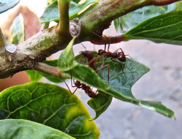 A colony of thousands of leaf-cutter ants forms a chain to file in an orderly fashion around my house to my large Virginia Creeper vine that hangs over my terrace. It is their intention to crunch the life out of leaf after leaf by grasping them in their razor jaws and slicing off neat packages to carry off to their nest.