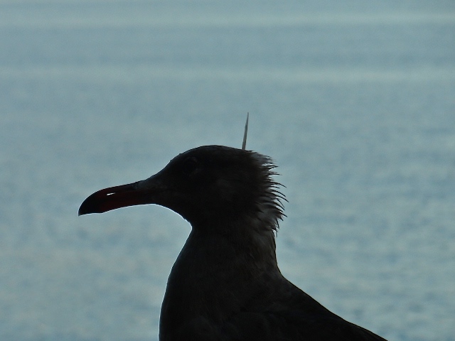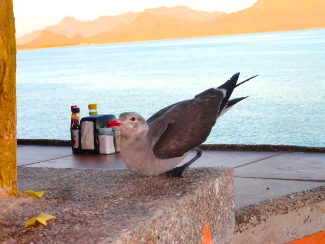 DSC00124 DSC00131  DSC00155 DSC00158 DSC00143DSC00146DSC00144 DSC00145 I never did figure out what was sticking out of this gull’s head.  It looked like a toothpick or porcupine quill that had grown into his skull.  He didn’t seem to be in any duress and he spent some time surveying our totopos from close proximity.  We didn’t throw him one because when we had done so for another gull earlier, within seconds, 20 or more gulls were swooping in for their portions.  We hadn’t realized we were the objects of such close attention, and I’m sure the waiters, pictured above, must not have appreciated it, but they were too gracious to comment.  We showed appreciation by throwing no further chips, although a man next to us did.  I got a wonderful shot of him eye-to-eye with a gull, but then realized my camera was on movie setting so will perhaps publish it at a later date. Tomorrow, on to Ontario, California to see Jeff and Debbie–my much-appreciated but not often seen stepson and his wife.