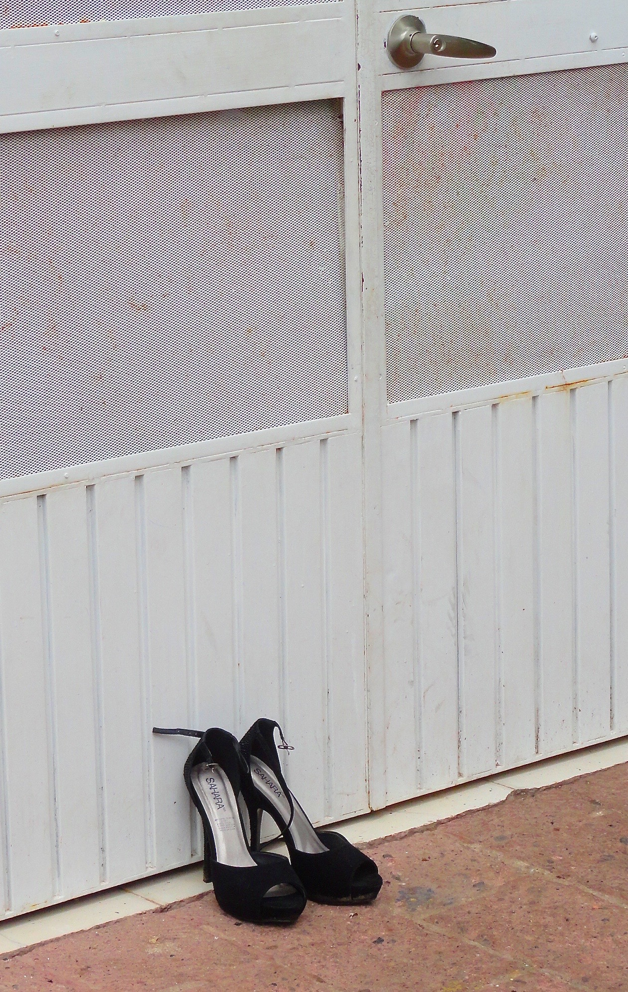 Aha.Silly me for labeling two posts with the same title. The story? Last year I did weekly art projects with the girls at a home for severely abused girls. One day I arrived to find these shoes outside of the door. I just loved the shoes and the story they told. They were actually the shoes of a girl who had recently turned 18 and moved out of the home. She’d come back to visit. I sitll have no idea why she took off the shoes and left them outside the door of the residence. It was inside a compound, so no fear of theft. I imagine as sexy as they look that they were very uncomfortable and she didn’t relish wearing them on the climb up the long staircase to the dormitory. Or, perhaps she had stinky feet and was airing them out. Nah. too unromantic. The other possibility is that she is waiting for her prince.