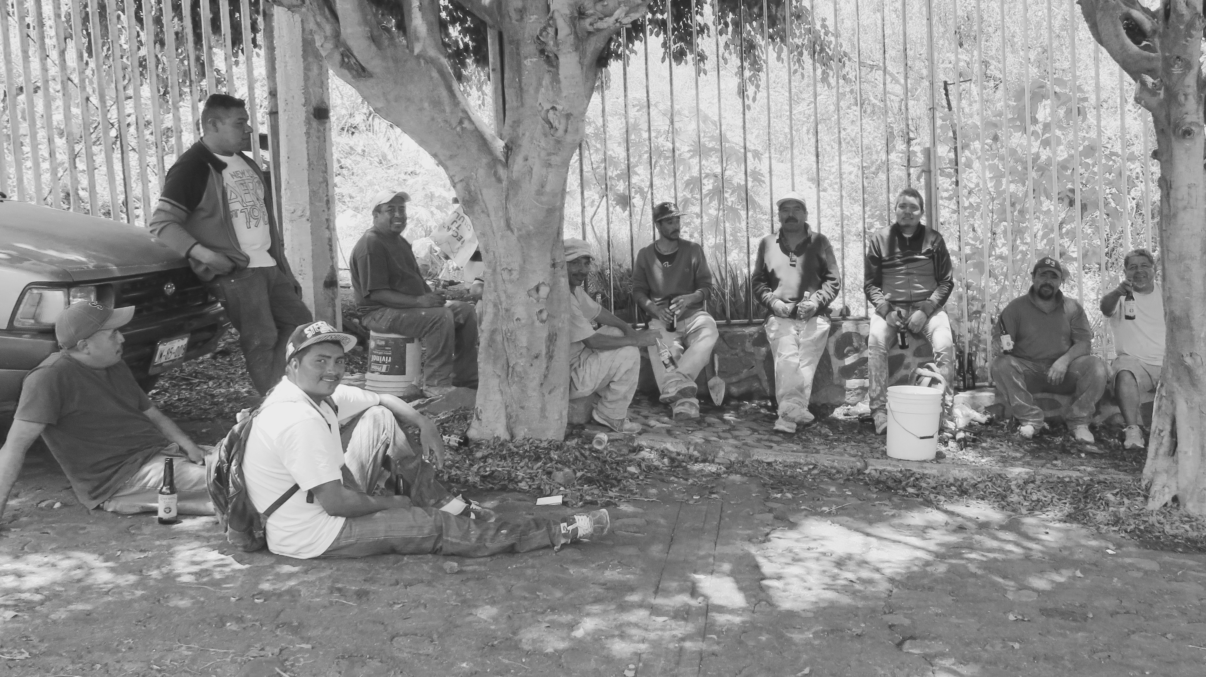In Mexico, at 2 o’clock Saturday, all labor ceases. Since we’d been without electricity for 12 hours by then, I went to the neighborhood little grocery store to buy ice and saw my friend Agustin and his construction employees in the shade of trees by the road, enjoying a Saturday end-of-labor beer. When I asked if I could snap a pic, they said of course, yes. When I asked if they wanted ten pesos ( a joke–what many ask when you ask to snap a pic) Agustin joked back, “No, a beer.” So I contributed a six pack for their pleasure!!! They protested a bit, but not much.