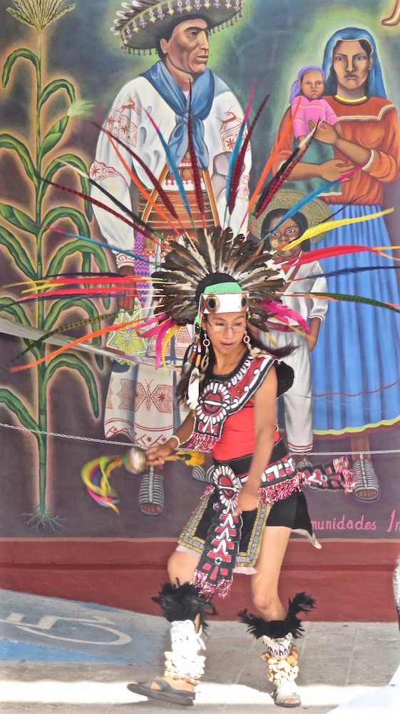 This studious-looking dancer seems aware of the disapproval of the Huichol woman behind her.