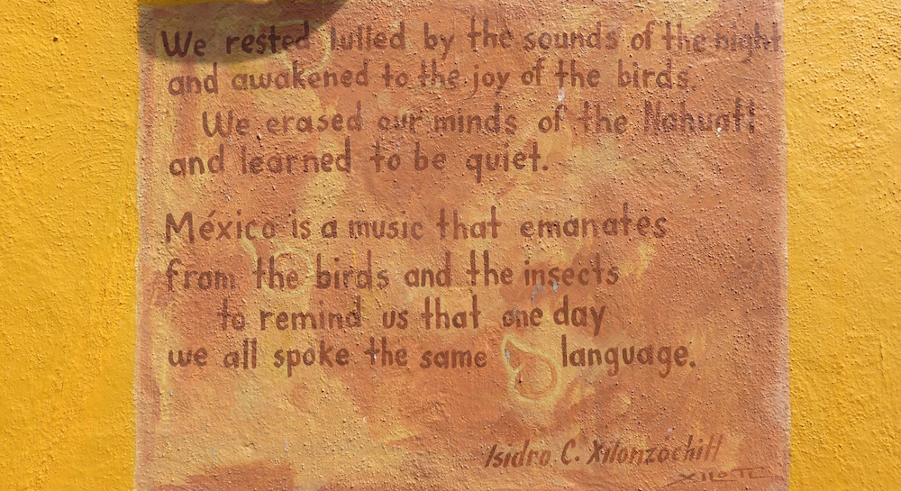 I asked Isidro to translate “In Mexico There is Always Music”–the name of a piece I had written–into Spanish. Instead, he wrote a brief poem on that subject in Spanish which I then translated into English! So this is a see-saw bit of poetry that I then had him paint on my wall.