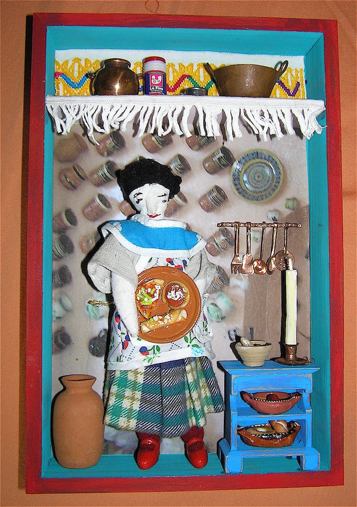 The miniature copper and clay pieces in this retablo are all handmade, as is the little hutch. The doll, too, was handmade by a woman in San Miguel, although I added the red shoes and apron. This retablo is one of a series called “Sacred Spaces: Women’s Special Places.” I’m showing this one in honor of Lew-Ellyn Hughes, whose blog you can see HERE.
