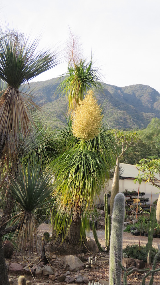 There are 25 species of succulent plants included within the genus Nolina, mainly distributed from California to Texas and into Mexico, where the majority of species are found. Rosettes of different species may be stemless or on tall woody trunks. Tiny serrations on the leaf edges make them feel rough to the touch. The decorative inflorescence bears thousands of tiny cream-coloured flowers.