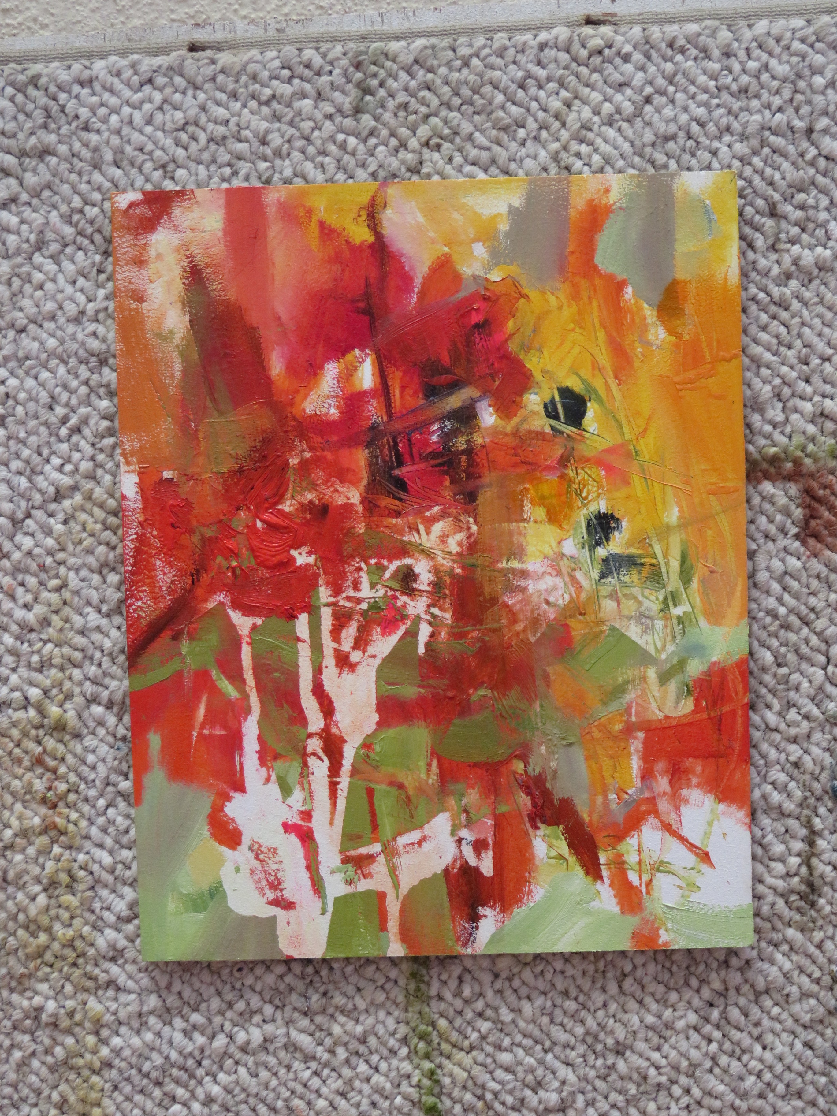 and I realized that the challenge would be to keep those red and yellow flat areas from getting fussy, by adding details that would suggest bougainvillea. How to maintain the integrity of this as an abstract combination of colors and textures, while still referring to the flowers that inspired the work?