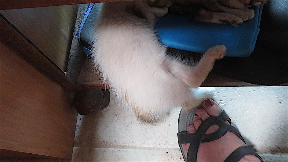 IMG_6904 ← Previous Next → Busy at my computer, I felt something soft on my foot and looked down to see what seemed to be an impossible feat of balance.