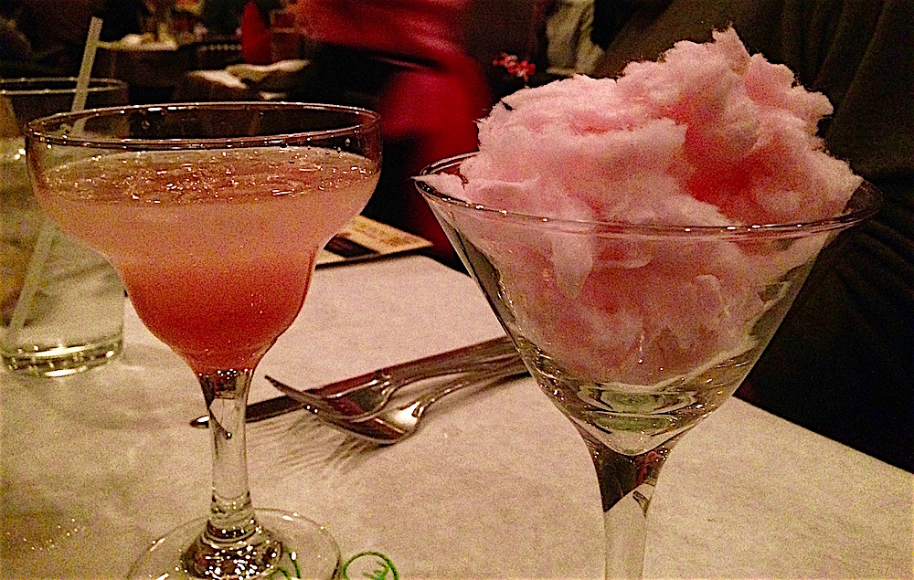 The Rib and Chop House marked National Breast Cancer Awareness Month by having the wait staff wear pink T-shirts and serving cotton candy margaritas. They filled the glass with cotton candy, then poured a margarita over it. The result was the glass you see to your left. We ordered them, but my friend Patty had to drink mine.
