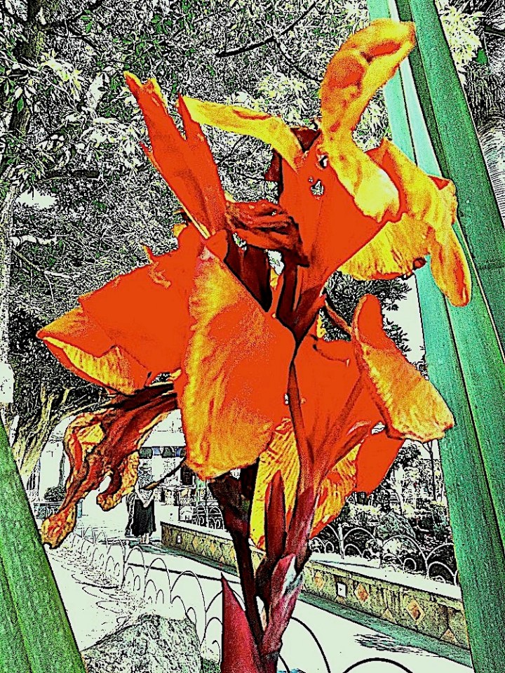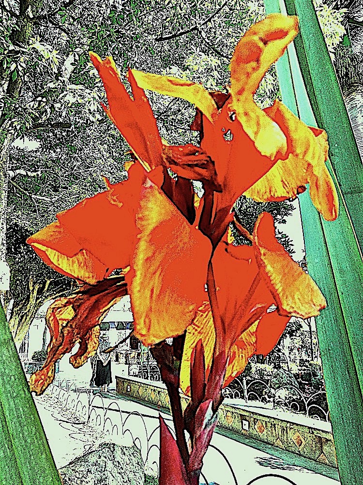 I’m beginning to think that the problem is that the leaves on either side of it are for another plant. That would make the mystery easier to solve and I’d just say it was a variety of canna liliy.