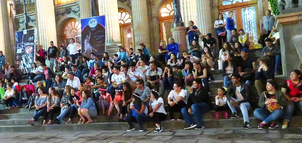 IMG_1970 ← Previous Next → A crowd gathered on the steps of the theater for a mime performance. We were eating at the restaurant across from them.