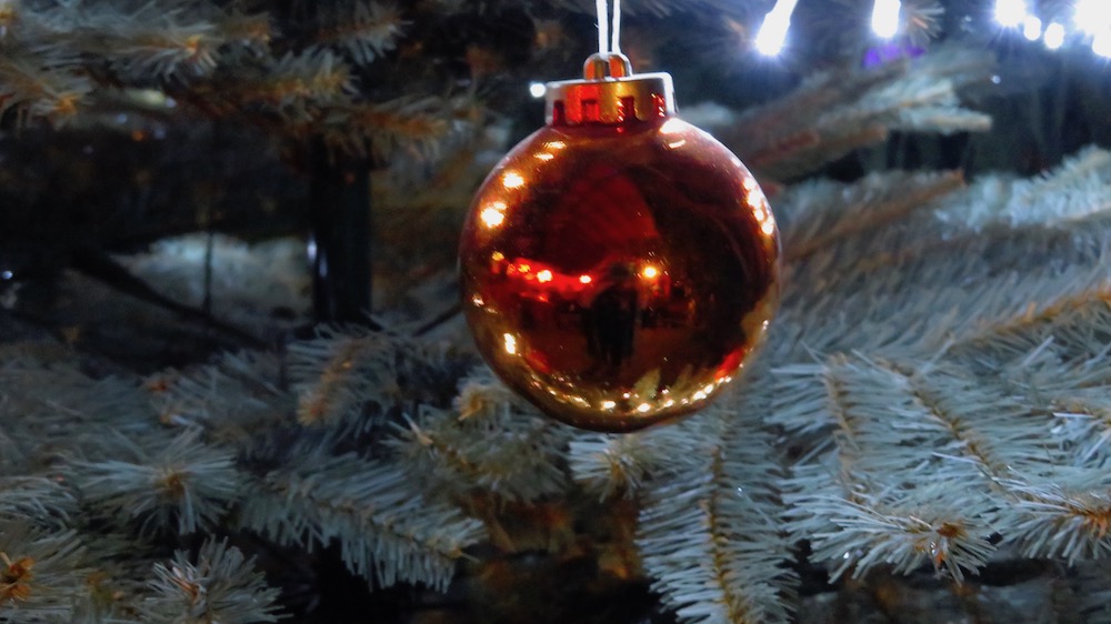 Me, barely reflected in the Xmas tree bulb in the courtyard.