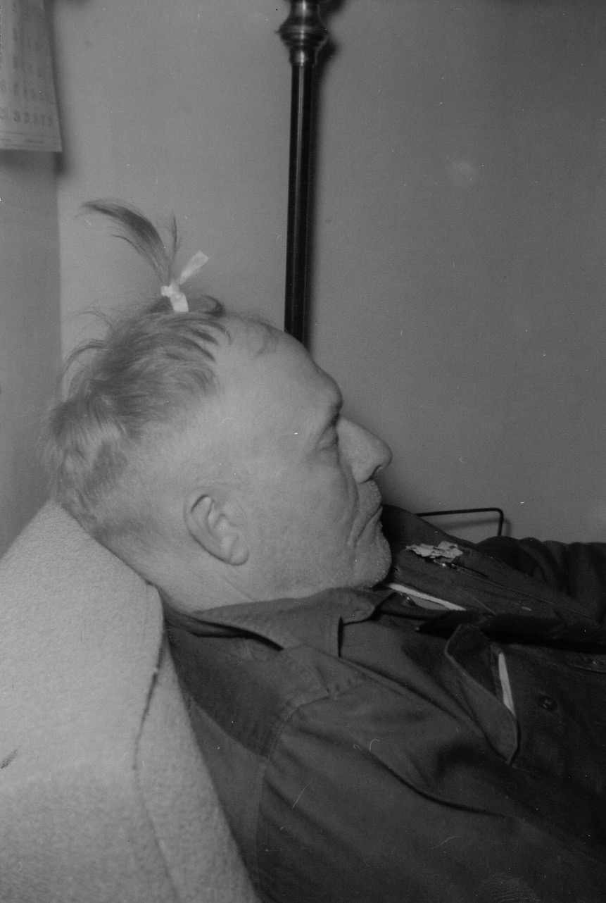 I gave my dad this exotic hairdo while he was sleeping, then left the room. Before I could get back, he awakened, put on his hat and went to Mack’s Cafe to meet his cronies for coffee. When he got there, he took off his hat and gave everyone a big surprise! Most of all himself.