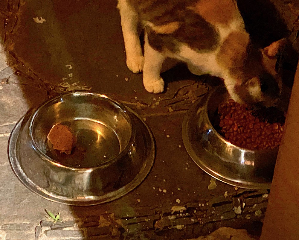 Which doesn’t seem to work any better than the cat food. Kukla was driven to condescending to her dry food.. Go figure. Dogs consider cat food a luxury. The reverse seems not to be true. But, at least the chicken stock is starting to smell really good!