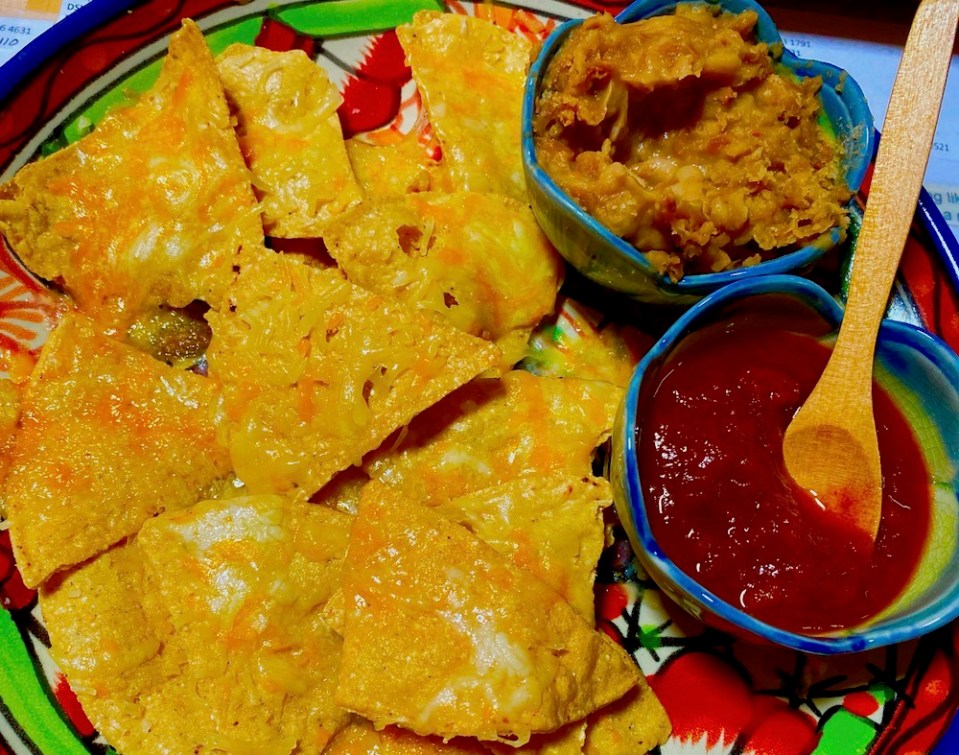 Nachos with salsa and refried beans.