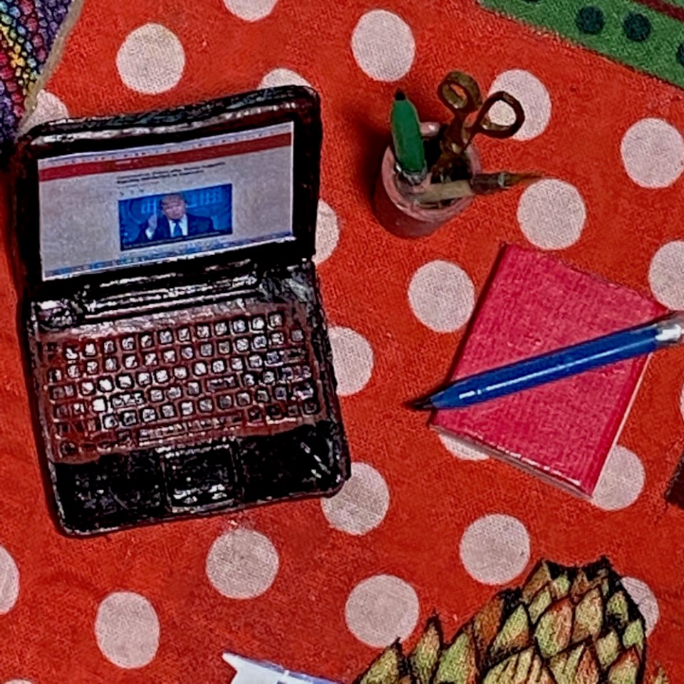 IMG_7989 ← Previous Next → I painted the little plastic computer and added the topical news to its screen.These items all fabricated except for the scissors.