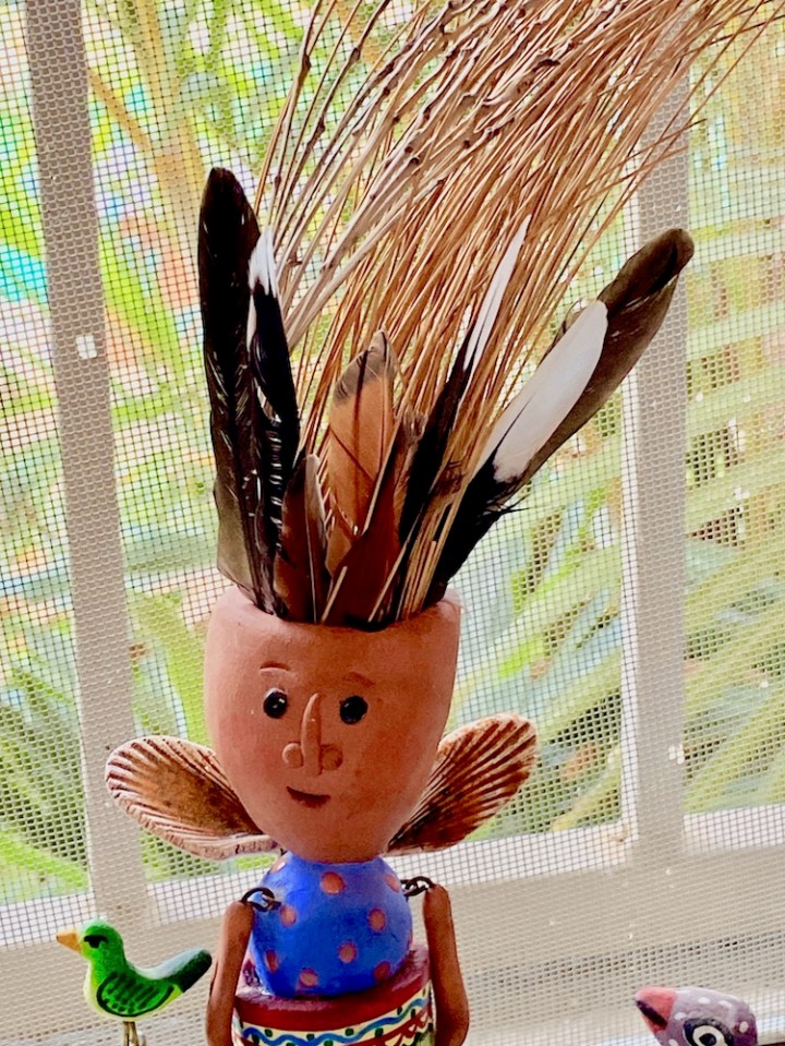 The little headdress is composed of the feathers of birds that my cats have regrettably brought to me as offerings. This little shrine honors their too-brief lives and reminds me to be prompt in my feedings.