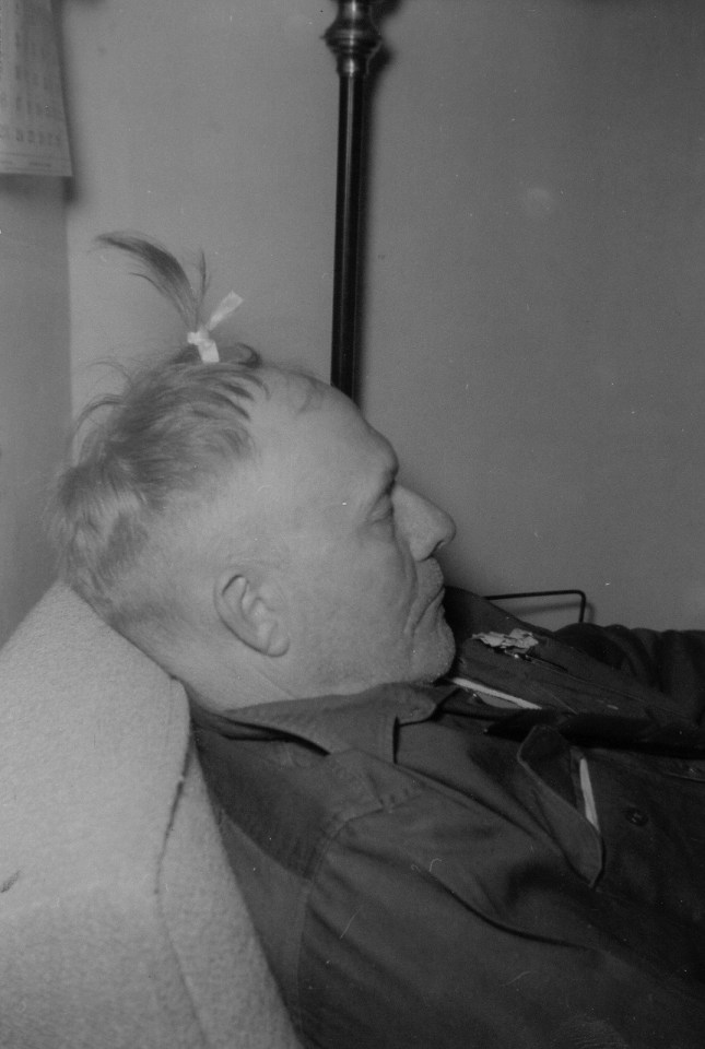 I gave my dad this exotic hairdo while he was sleeping, then left the room. Before I could get back, he awakened, put on his hat and went to Mack’s Cafe to meet his cronies for coffee. When he got there, he took off his hat and gave everyone a big surprise! Most of all himself.