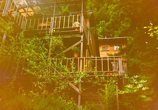 To show you the magnitude of the problem concerning fire in Boulder Creek, this is the house we owned and lived in for 14 years. It was built up on stilts on the side of the mountain and it was surrounded by huge redwood trees that came right up to the house, even through the deck in places. We were at the end of a road that fed into a twisting double-laned shoulderless road that wound down the the mountain. The entire area was this dense with redwood trees. The first photo is a view from our deck. The second is the view down to the treehouse Bob built for the kids. The third is looking up at the house from the only flat piece of ground on the two-acre property. It was where I planted my garden and built fish ponds. We also planted bamboo all around that little ornamental garden. As you can see, once fire took hold, there would be no chance of saving it.