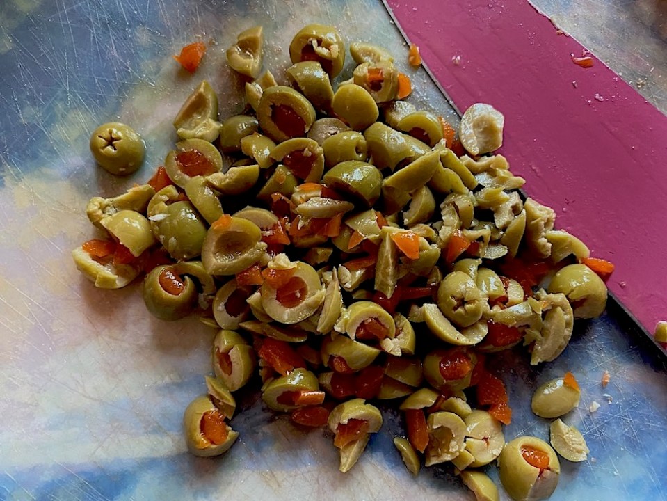 1 cup green pimento olives (one 5 oz. jar, reserving the liquid)