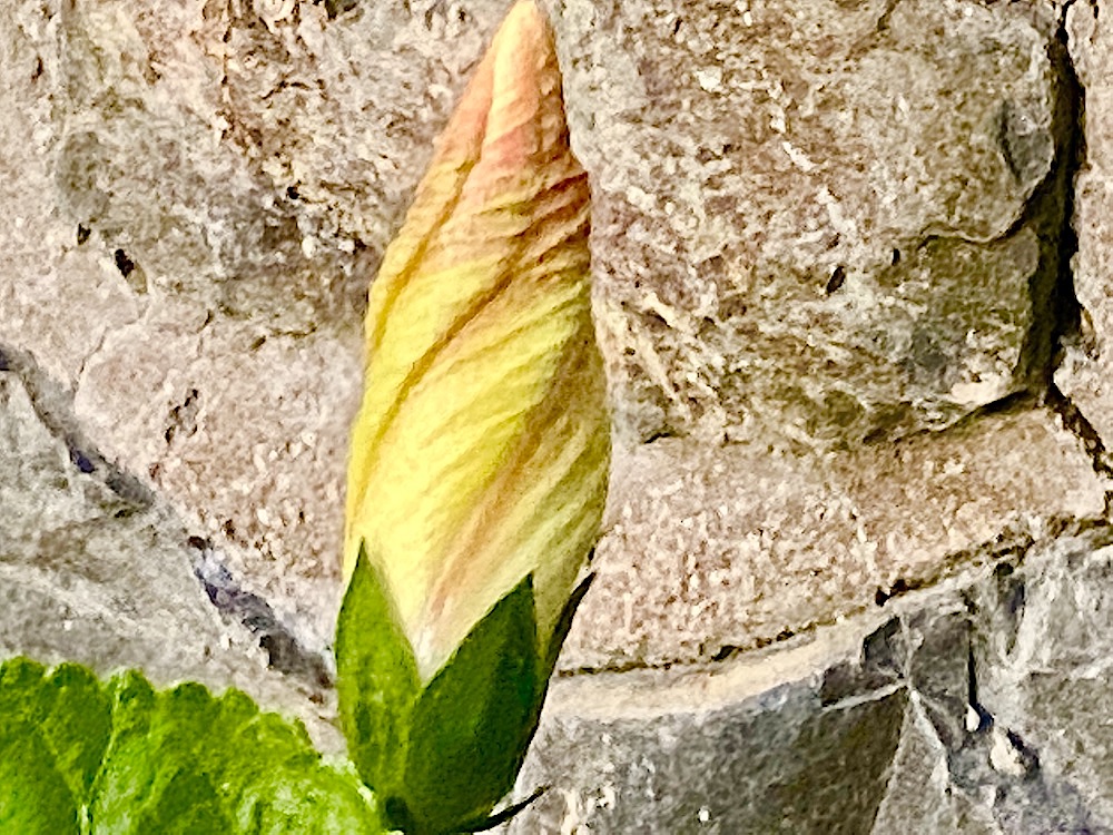 Hard to believe that this is a bud from the same hibiscus plant that I published a photo of yesterday–that time a fully opened bloom. This is the picture of the bud I took yesterday.