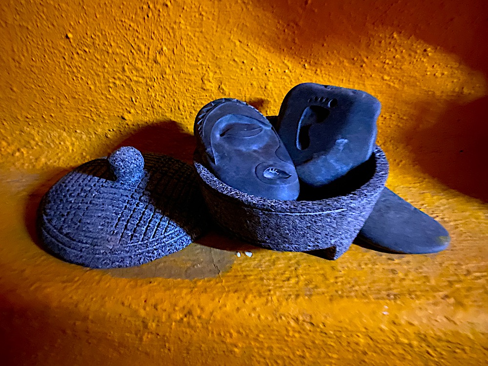 This is what was changed..this stone dish containing two large carved stones.The stone on top–the head –was carved by my husband Bob. The one with the foot impression on one side and a hand on the other was carved by a friend.