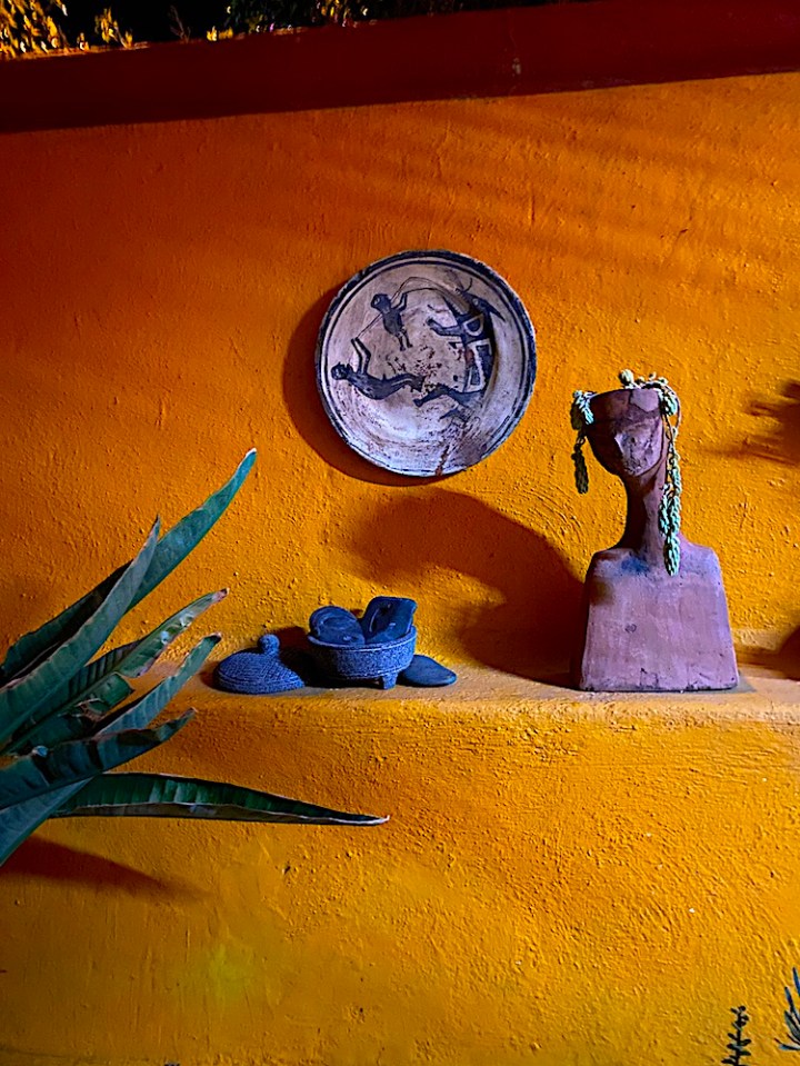 Tonight’s solution was to remove the planter on the left and substitute a lava stone molcajete with two carved stones inside to break up all the rectangular shapes. .