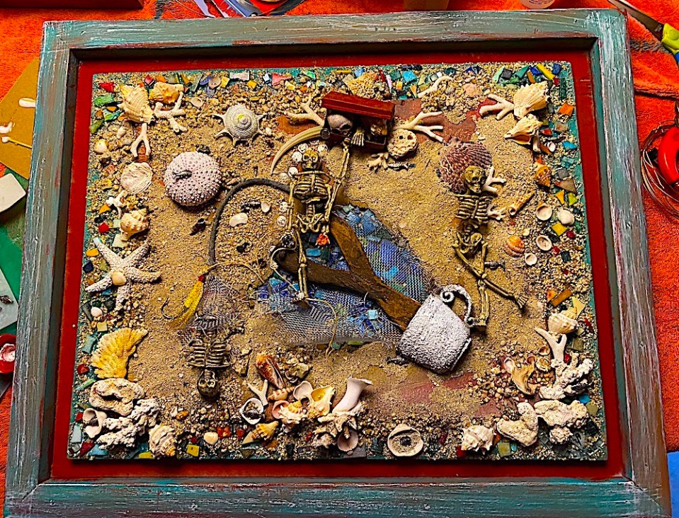 Davy Jones Locker: Davy Jones’ Locker is a metaphor for the bottom of the sea: the state of death among drowned sailors and shipwrecks. It is used as a euphemism for drowning. Silver coins spilling from a pirate chest seem to be doing these victims of shipwreck at sea no good at all. I collected all of the shells and sand used in this piece from various beaches in Mexico.