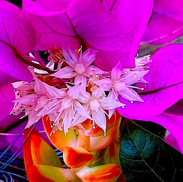 In 35 years of growing bougainvillea, I have never seen the central flower bloomed out like this!
