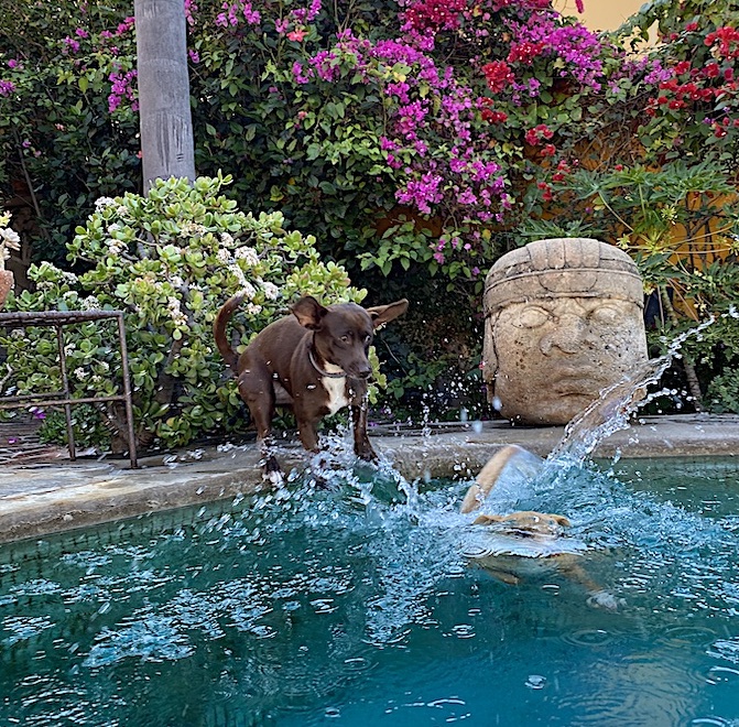 Zoe, misbalanced by Coco’s head under her tummy, splashed into the pool