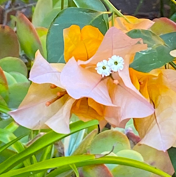 Andrew, the little white bits are the flowers. What look pale salmon-colored larger petals are actually the leaves of the plant.