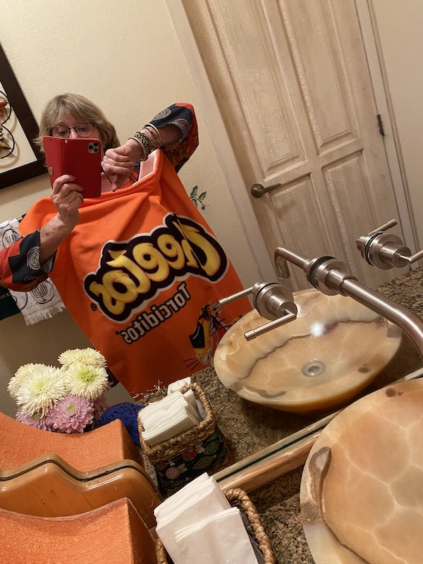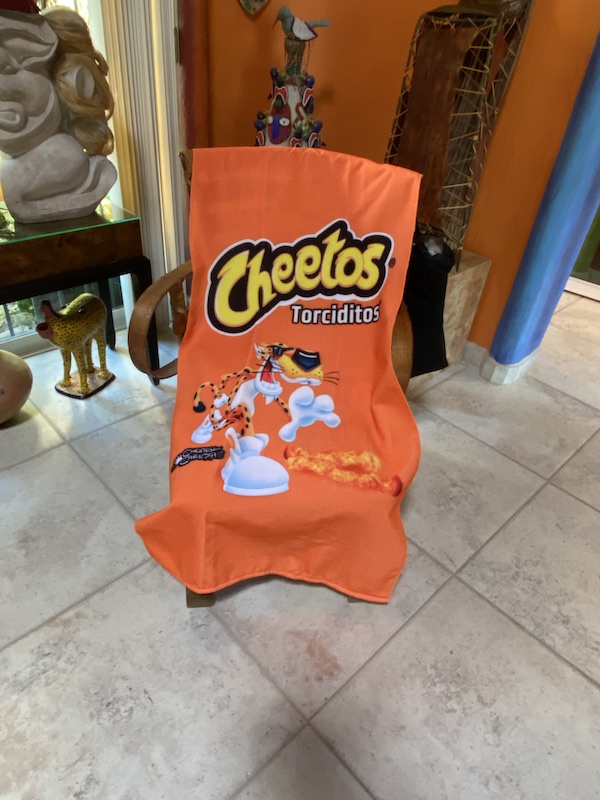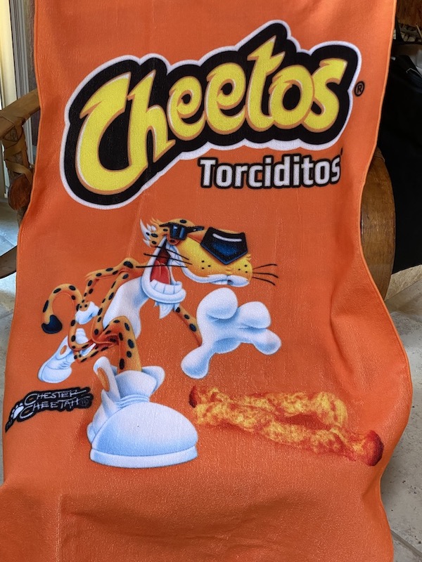 Now, if you take a less closeup view of my bag of Cheetos, you can see that it is a very large bath towel with an image of a bag of Cheetos Tordicos on it.  It turns out that they went to a lot of work to locate it in Liverpool, where they were sold out, and finally located it on the internet. They know me so well. Not only is this my favorite food on Earth, but I have been looking in vain for a full-sized towel to use in the pool.