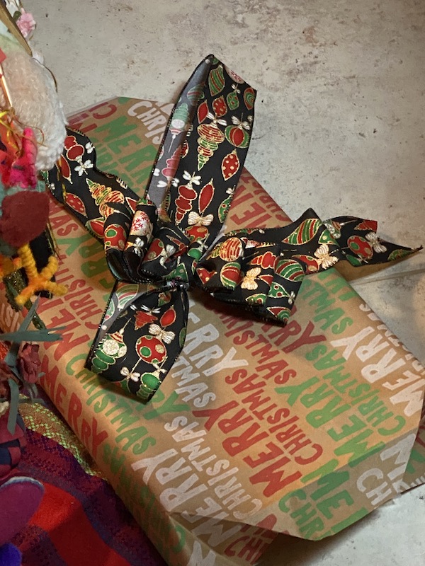 Two days ago a mysterious, beautifully-wrapped gift showed up under my Christmas tree.  Since it was my only gift to open and so beautiful, I still hadn’t unwrapped it until today when Sergio, my next door neighbor, came over to borrow chairs and TV trays for his party. He insisted I open it, but the wrappings are shown below.