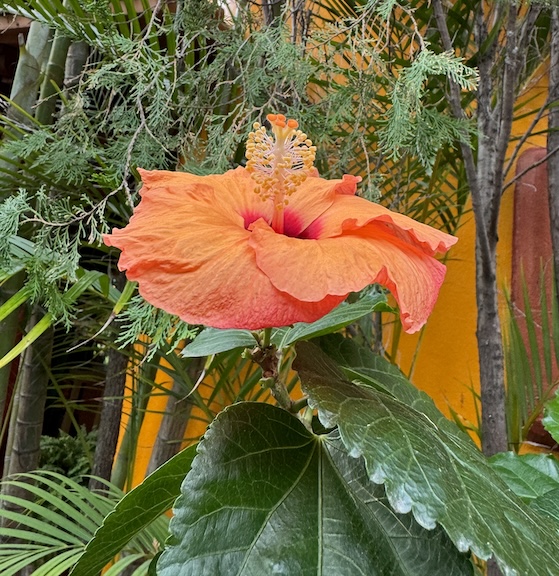 This orange hibiscus creates the fewest blooms of all the hibiscus in my garden. Makes me appreciate it all the more. Absence does make the heart grow fonder.
