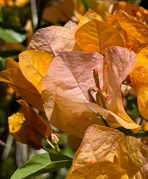 I was so used to red and purple bougainvillea, when I first saw this peachy-orange color (in Israel) I was astonished! In Israel, there are bougainvillea seemingly everywhere, and they have many colors. ~Ed.