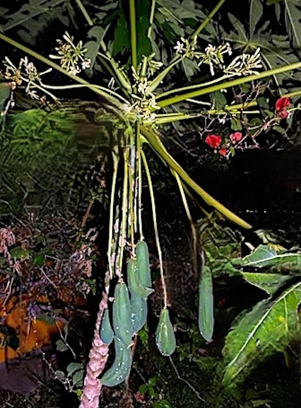 This morning I noticed these leaves on the pedestals on either side of the door that leads from the street to my front garden, but it wasn’t until Paciano arrived that I noticed the 3 inch wide trail of leaf parts that extended almost the entire distance across my lot from the pedestals to the kitchen door and then mysteriously stopped! It was solid stone the entire way and there was no hole in site that might have led into their underground abode. Why would they have stopped there and why so many different segments–so many that they formed a solid carpet? If it had been a rain, it would have washed the leaves away or at least disarranged them. These tiny segments, much smalled than the leaves pictured above, formed an absolutely straight and orderly pathway almmost entired covered with green. It indicated that thousands of ants had set down their burdens at exactly the same time and left. What could have caused this? In my 23 years of observing leafcutter ant behavior, I had never seen it before.
