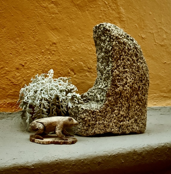 Moon-shaped rock and frog made out of sap from a rubber tree.