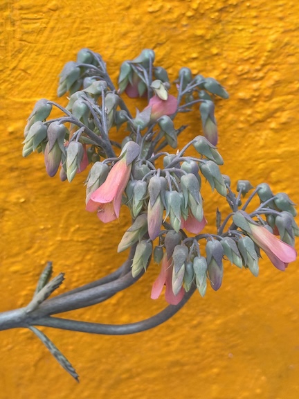 A spike at least 3 feet high grew straight up out of a large planter in my front garden. I had not a clue what it was. Certainlly not something I’d planted. I kept thinking I’d cut it down or move it but finally just directed it away from a sculpture it was growing directly in front of. It had no flowers or leaves and was not that attractive, but I was rather intrigued, wondering how tall it would grow. Then the other day I saw that it had pushed out blooms. I looked it up and learned that it is a variety of kalanchoe–one of my favorite flowering plants. I certainly have never seen one like this, however.