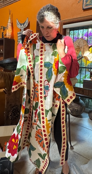 IMG_7836 ← Previous Next → Liz gave exotic gifts to us all from her line of clothing and house linens. Here Chris models her kimono.