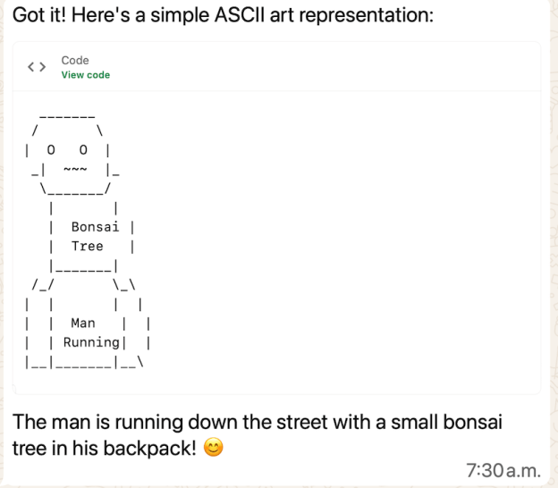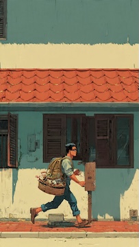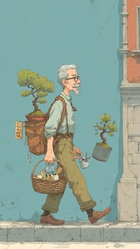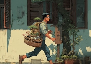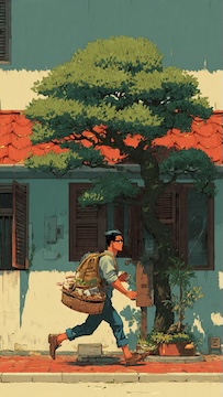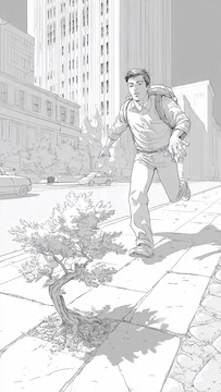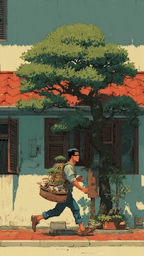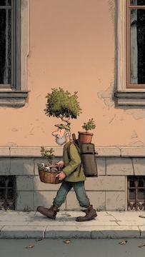 My message to AI: Can you draw me a photo of a man running dow the street with a. small bonsai in his knapsack and carrying a basket of other small assorted items.