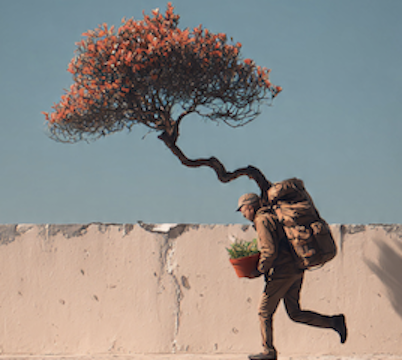 No, Use the same photo as the one before this one with a small bonsai in his knapsack and no other bonsai.