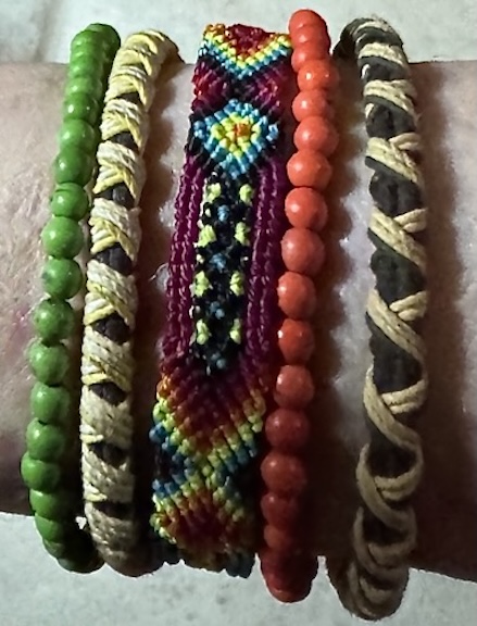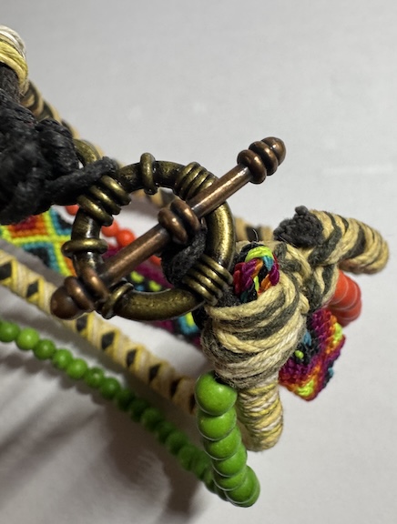 It is turquoise, woven thread, clay and fiber. The woven and fiber bracelets I bought from different beach vendors. The beads I strung. Below is the clasp, but my finish work on the back is kind of messy. I’ll show other solutions and bracelets tomorrow.