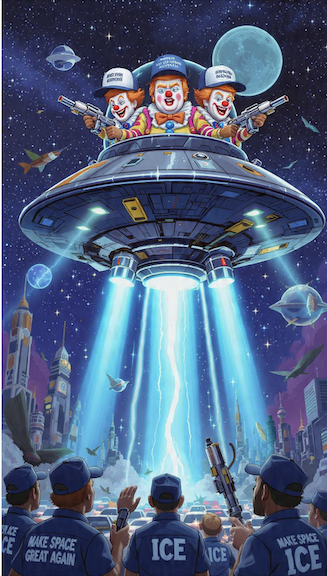 Hope springs eternal, so I’m using this farcical response to the dVerse prompt this week, no matter how farfetched!!! The hats on the guys in the UFO are supposed to read “Make Space Great Again,” but couldn’t get AI to cooperate. They came close, so have some of the ICE agents displaying their motto instead. Perhaps they have been in cahoots all along.