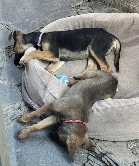 These two have a TALENT for inviting attention and have actually worn themselves out for the time being. Their “keeper” actually looks a bit the same right now. I’m lying in bed, having given all the puppy attention I’m capable of at the time. Their sister Bonita is happily ensconced in a new family, as demonstrated by the video I posted yesterday. These two are awaiting their futures. They are wanting ever more attention, and inviting yours!!! My phone is 331-860-5304 if you’d like to come make their acquaintance and live close enough to the San Juan Cosala Raquet Club to do so..