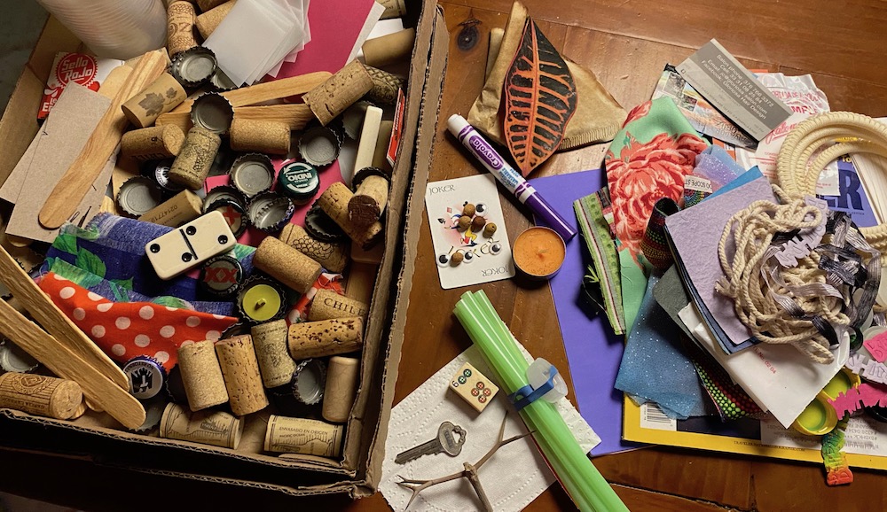 So, this is what I did, assembling a half dozen or so collages out of the most unlikely materials–rubber mice, cut up thin metal jam and butter lids I’d collected on a European vacation, confetti, paper sculptures I’d cut out of pages of old poems. I know. Weird. I remember one of the titles was, “Party mouse wants to come out to play, but can’t.”