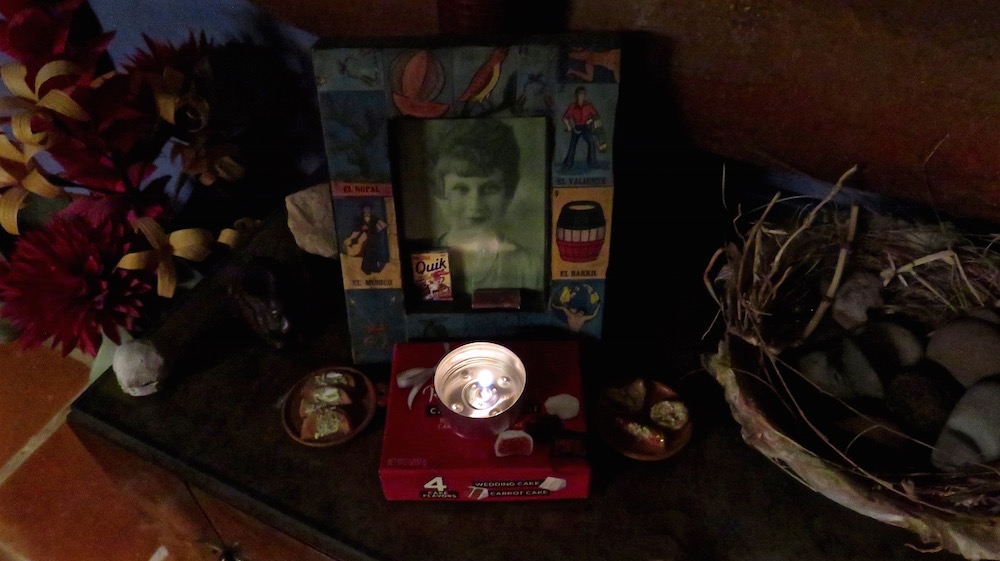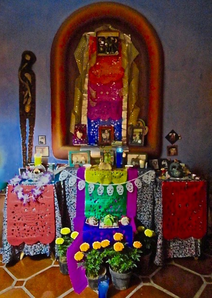 Not the same thing as Diego’s past gentle nuzzles for attention as I lay in the hammock, fitting in those moments of mutual attention before Zoe’s insertion of herself between us, demanding attention from us both. Here is no filling of an empty space, but rather the creation of a new one in my life. One not unaccompanied by problems, for although she shares Diego’s calm exterior, she also shares Zoe’s propensity for mischief. Minutes after we arrived home from the craft fair where I found her attached to the leash of the Guadalajara vet who had rescued her from the street and harbored her as she looked for a new home for her, I found her on top of the the altar, eating the dead bread in front of my friend Gloria’s picture, ignoring the dog bones in front of Diego’s. The papel picado on the front of the altar had been shredded by her ascent, the pot of marigolds turned on its side.