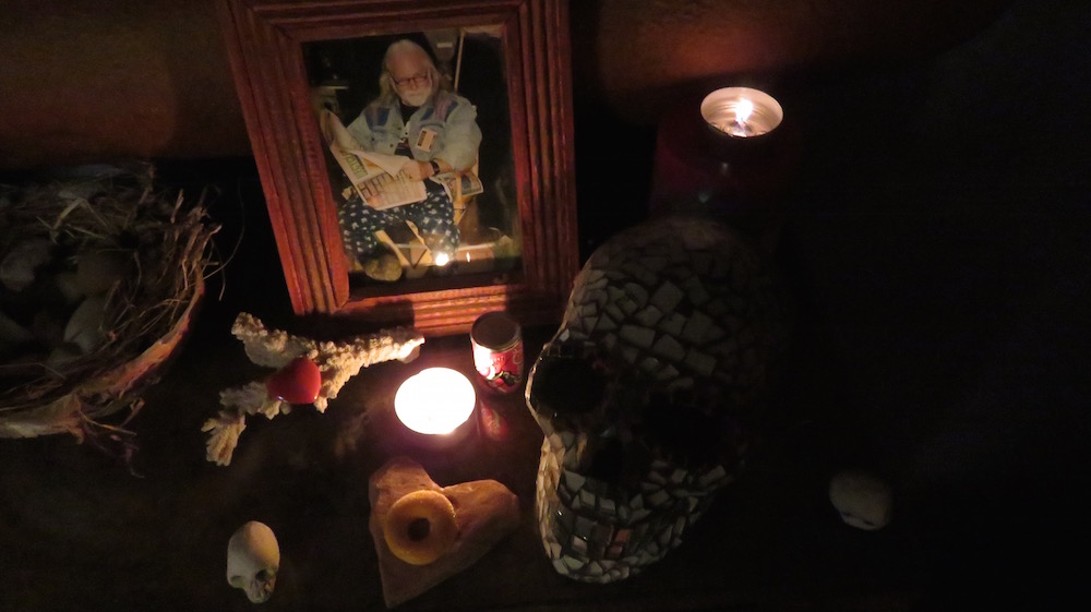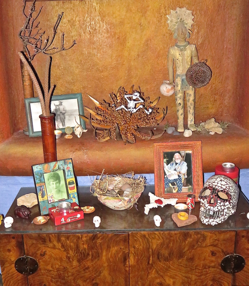 If you read my post yesterday, you know that we lost Diego on Saturday. When I took him to the vet thinking he had a bad tooth, I discovered his lungs were actually riddled with cancer and we had to make the decision to save him from a more agonizing slow death over the next two weeks. Obviously, I was devastated and as I completed the shrine for my friend Gloria, who died a few weeks ago and my husband Bob and parents as well as my sister Betty and her husband Denis, Leah and Ryan completed side shrines for their own departed family and shrines.