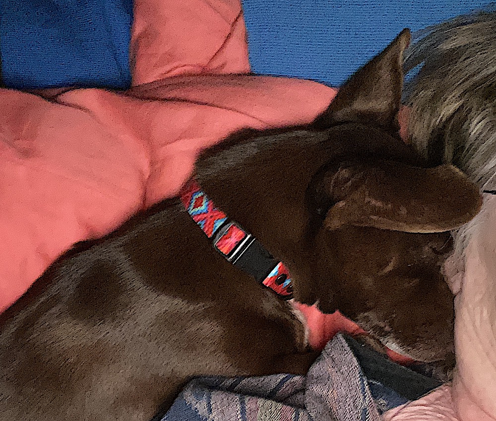 Finally stilled from the excitement of a new sister who is nearly a reflected shadow of herself, Zoe sleeps in the long cavern between my knees and ankles so I am swaddled in small dogs. Not a recompense for the loss of my old friend Diego, but rather a slight adjustment of attention, a comfort of sorts, consolation like the hug of that stranger in the vet’s office yesterday morning, after we had sent Diego to his final sleep.
