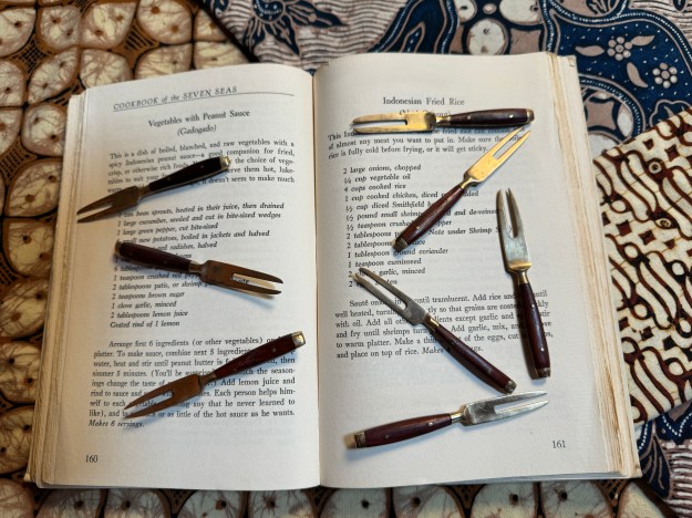 *As a footnote, when I moved to Mexico, I sold the entire set, but years later, seeing just the shrimp cocktail forks that exactly matched my lost set in a second hand store, I bought them. They are pictured above on a cookbook. Beneath the book are batik sarongs and napkins I purchased in Bali.