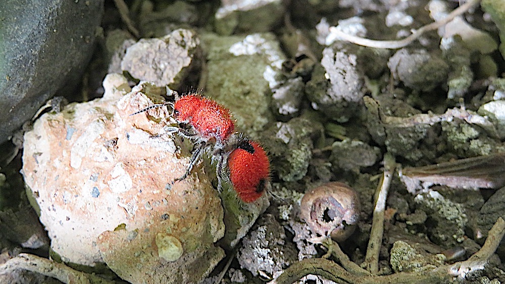 It reminds me of a cow-killer ant but it is much smaller and redder as opposed to the black and orange of the cow-killer ants (which are actually a variety of female wingless wasps) I’ve seen here on my property. It is probably a red velvet ant but has different markings, is brilliant red and much smaller than ones I’ve seen before. Click HERE to see a huge Cow-killer ant I saw a few years ago and to learn more about them..