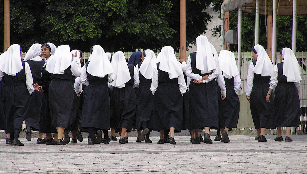 This is one of my all-time favorite photos, taken at the shrine of the Virgin of Guadalupe in Mexico City. I’ve been waiting for the proper chance to use it for a loooooong time. Now, finally, the perfect prompt! I love the one young nun turning around to look behind her–the rest blithely marching along–seemingly straight into that wall!