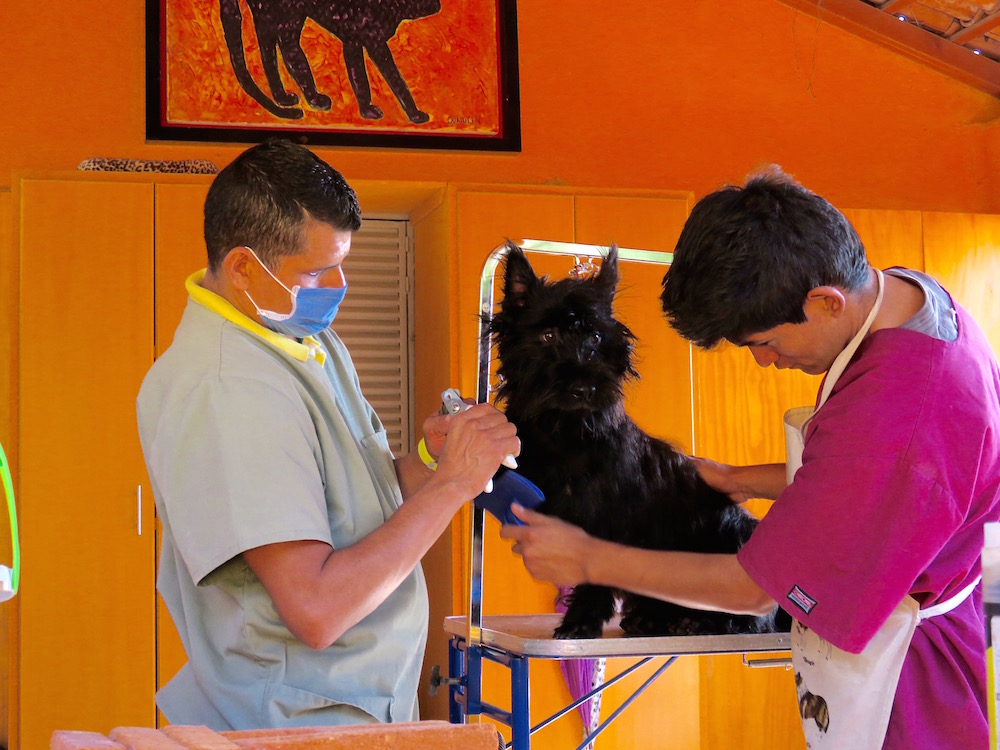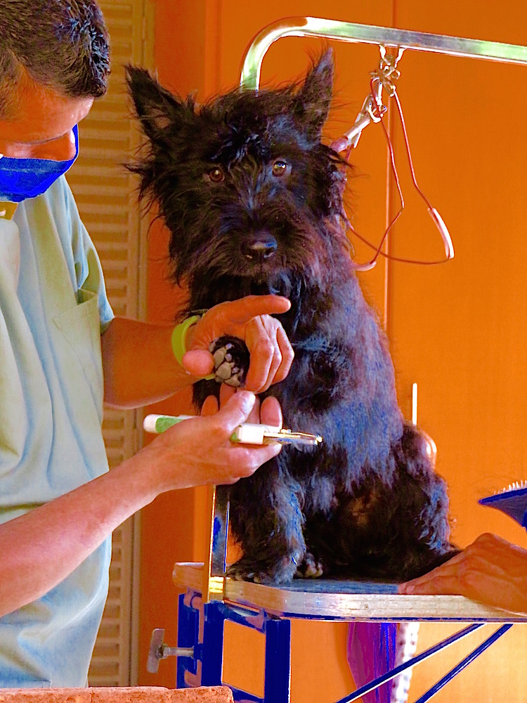 Yes, I was surprised that Morrie took so well to being pampered with an on-site bath, blow-dry, grooming and pedicure. (This enterprising young man has started a business where he comes to your house to groom and wash your dog. He seems to be popular as he was booked solid for a week. Fortunately, he had an appointment with a dog a block away from me so although I’m 5 km. out of town, he just worked me in after his other appointment.) Morrie was a bit rank. Hated to leave him with the house sitter in that condition. And yes, I was proud of the boy. And yes, he immediately went down and rolled in the dirt and the grass. A fella’s gotta have some pride, much as he seemed to enjoy the attention.